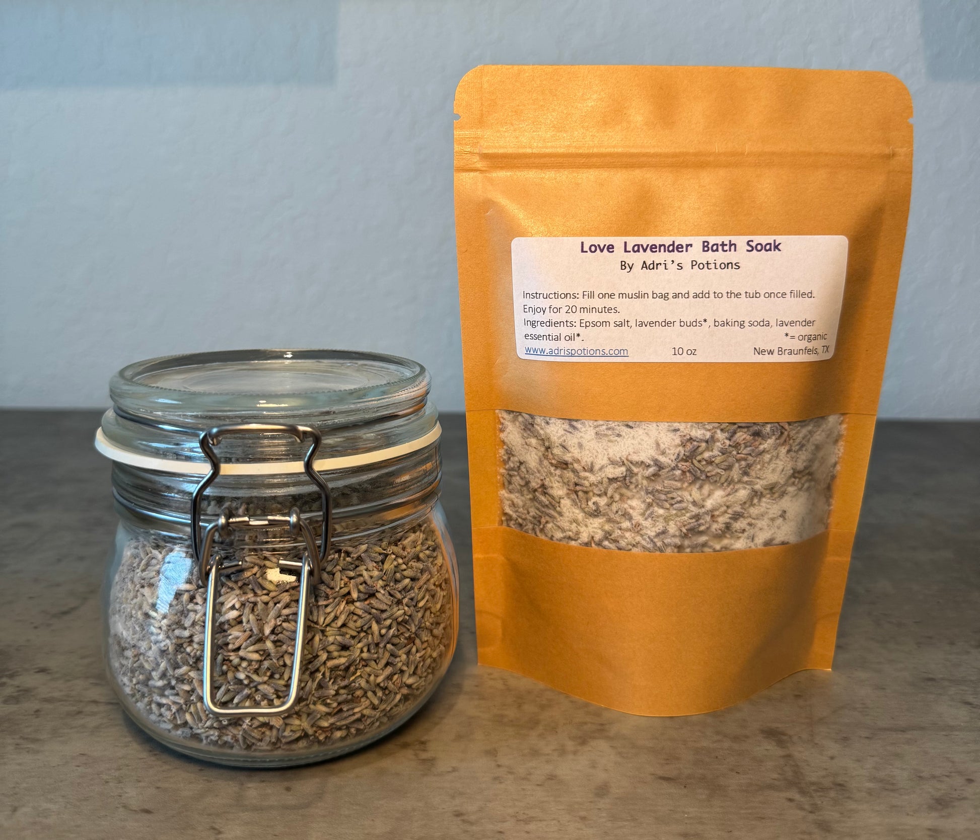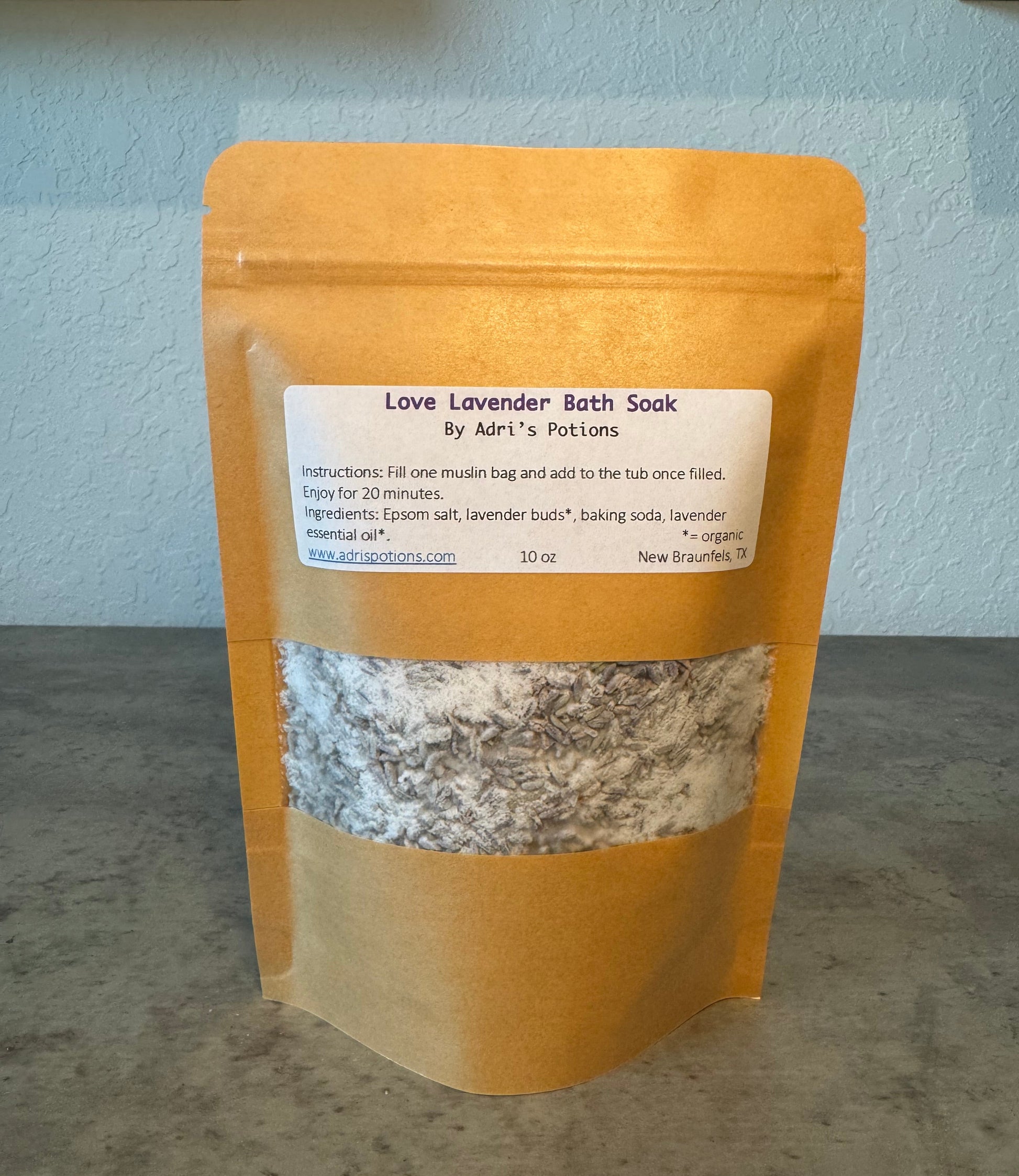 Ingredients: Epsom salt, organic lavender flowers, organic lavender essential oil, baking soda.